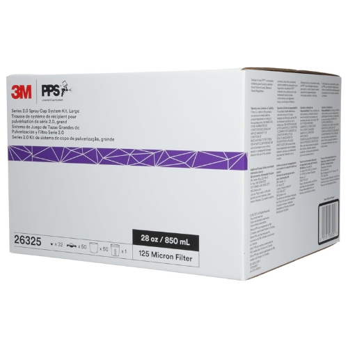 - 3M 26325 is a PPS Series 2.0 spray cup system kit in the Large 28 fl oz size with a 125 micron full diameter filter. It is designed for mixing, filtering, and spraying coatings with compatible spray guns using Series 2.0 adapters, and it supports efficient changeovers and clean handling in refinish and industrial workflows.