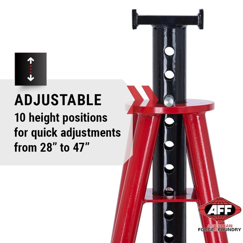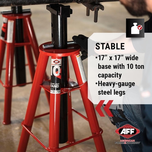 - American Forge & Foundry 3310B Jack Stand Set provides secure support for heavy trucks, trailers, and equipment. This set includes two high-capacity stands, each rated for 10 Ton, with an adjustable height range from 31 inches to 47 inches and a wide base for enhanced stability.