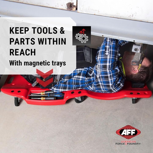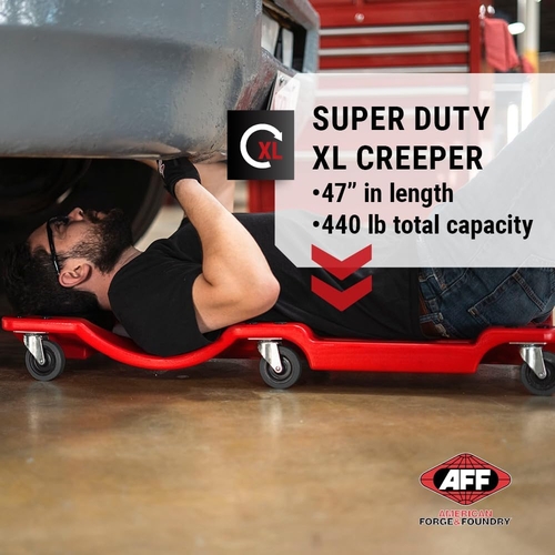 - American Forge & Foundry 3909 Mechanic’s Creeper is an XL Super Duty creeper with a 47 inch length, designed for professional service use under vehicles. Rated 440 pound capacity, it features padded headrest, magnetic tool trays, ergonomic design with vent holes, and six 3-inch polyurethane swivel casters for smooth movement.