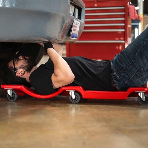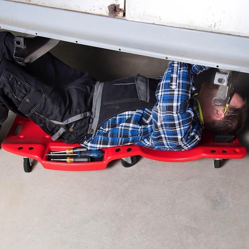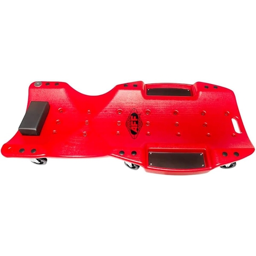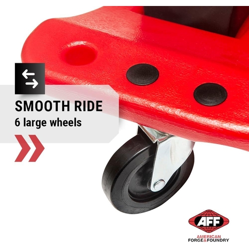 American Forge & Foundry manufactures the 3909 XL Super Duty Creeper for heavy-duty automotive work. Its extra long length, durable HDPE build, padded headrest, and accessory trays are designed for comfort, efficiency, and heavy use under full-size vehicles.