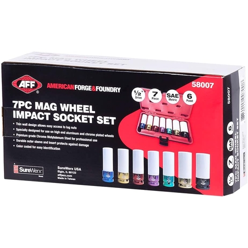 - The American Forge & Foundry 58007 Mag Wheel Impact Socket Set, 1/2-inch Drive, 7 Piece can also be referred to as AFF 58007 wheel socket set, AFF mag wheel socket kit, AFF protective sleeve impact socket set, AFF 7-piece mag wheel set.