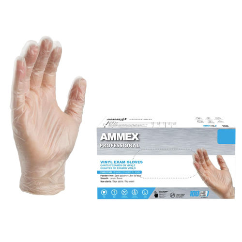 - The Ammex VPF66100-L clear vinyl disposable gloves are powder-free, latex-free gloves offering economical barrier protection for healthcare, food handling, lab, and light industrial environments.