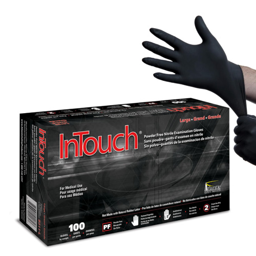 - The Atlantic Safety Products LGB311-L InTouch exam glove is a black, powder-free nitrile glove, size large, offering strong, flexible hand protection and tactile precision for medical, industrial, and laboratory environments.