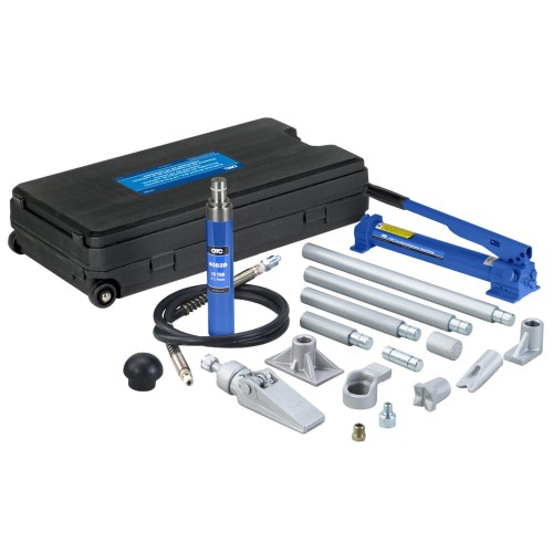 • The OTC 1519B 10-ton Collision Repair Tool Set features components that snap together, permitting you to apply pushing, spreading, or pulling force. With its versatile components, you can apply pushing, spreading, or pulling force to straighten metal panels, remove dents, and more. The set includes a two-speed hydraulic hand pump, a 10-ton ram with a 6-1/8" stroke, a ram flat base, a 1/2-ton hydraulic spreader, four extension tubes, a tube coupling, a ram toe, a wedge head, a serrated saddle, a flex head, a plunger toe, and a 90° wedge head. Everything you need to get the job done is included in this convenient set.