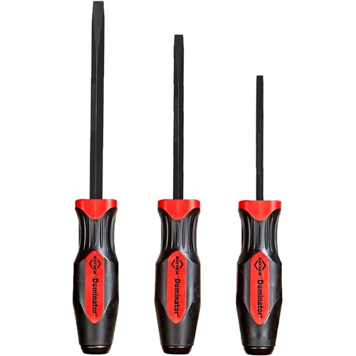 • The Mayhew 40180 Dominator Demo Driver Set is a three-piece tool kit combining screwdriver and pry bar functionality in one. Featuring 8 inch, 10 inch, and 11 inch lengths with the patented Dominator ergonomic handle and fully tempered alloy steel shafts, this set is designed for heavy-duty automotive prying and removal tasks.