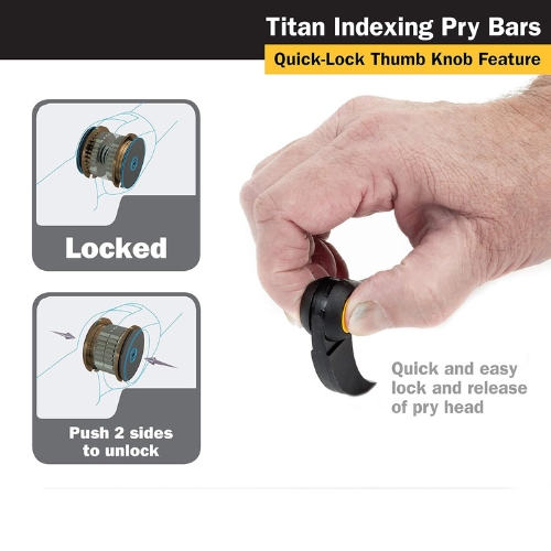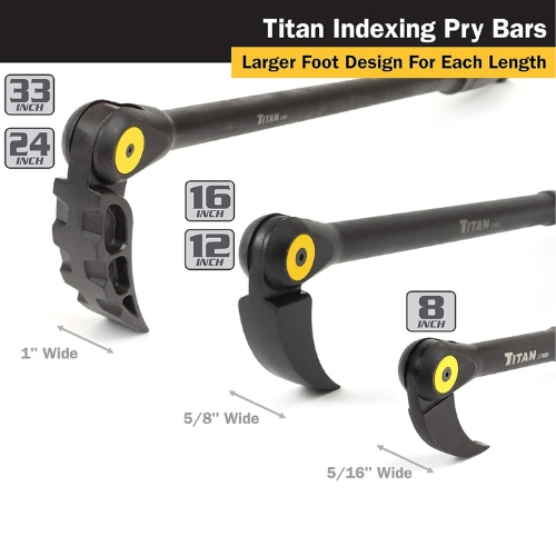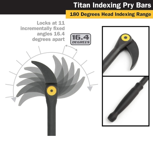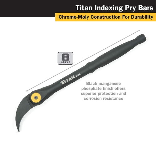 • The Titan 17808 Indexable Pry Bar 8" can also be referred to as adjustable pry tool, pivoting head pry bar, compact pry bar, angled pry bar, and multi-position prying tool.
