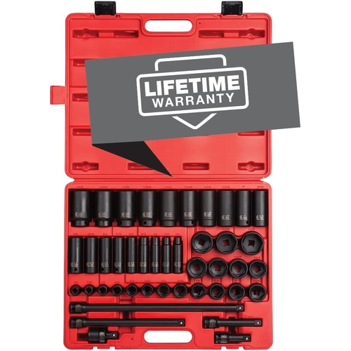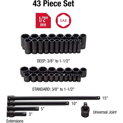 - Comprehensive 43-piece set covers SAE sizes from 3/8 inch to 1-1/2 inch in standard and deep lengths.