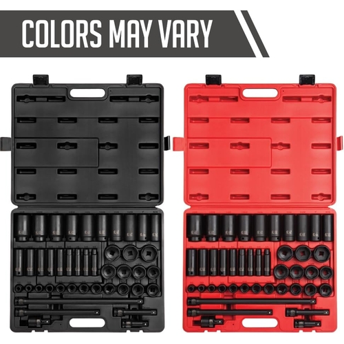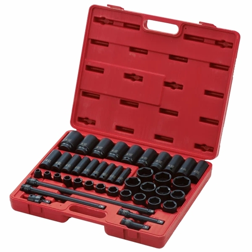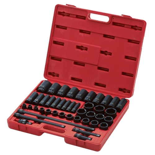 - 43 SAE impact sockets, standard and deep: 3/8 inch, 7/16 inch, 1/2 inch, 9/16 inch, 5/8 inch, 11/16 inch, 3/4 inch, 13/16 inch, 7/8 inch, 15/16 inch, 1 inch, 1-1/16 inch, 1-1/8 inch, 1-3/16 inch, 1-1/4 inch, 1-5/16 inch, 1-3/8 inch, 1-7/16 inch, 1-1/2 inch (each available in standard and deep lengths)