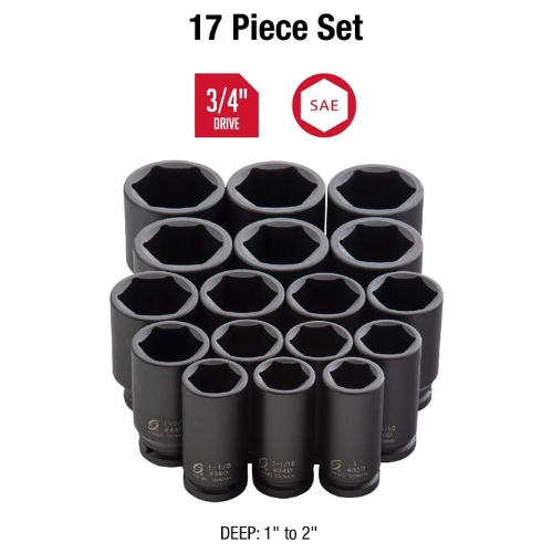 - The Sunex 4685 3/4 inch drive SAE deep impact socket set includes 17 deep 6-point sockets from 1 inch to 2 inches, featuring radius corner design, dual size markings, and Cr-Mo alloy steel construction held in a heavy duty storage case.