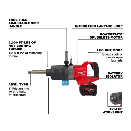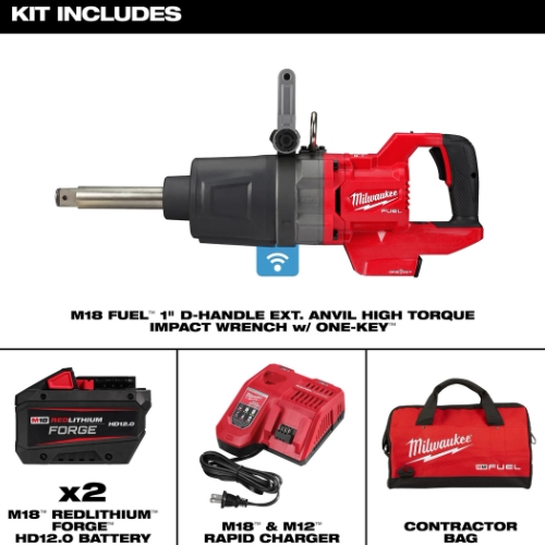 - The Milwaukee 2869-22HD M18 FUEL 1 inch D-Handle Extended Anvil High Torque Impact Wrench Kit with One-Key delivers up to 2,000 ft-lbs of nut-busting torque and 1,900 ft-lbs of fastening torque for heavy industrial applications; includes the 1 inch D-Handle impact wrench with extended anvil, two RedLithium Forge HD12.0 battery packs, an M18 and M12 rapid charger, handle, lanyard loop, and carrying case for cordless power and precise control.