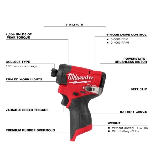 - The Milwaukee 3453-22 M12 Fuel 1/4 inch Hex Impact Driver Kit is a cordless driver kit designed for fastening and driving tasks. It is made for users needing high torque, compact size, and full accessory kit. Includes two M12 Redlithium2.0 batteries, a charger, belt clip, and carrying case for jobsite readiness.