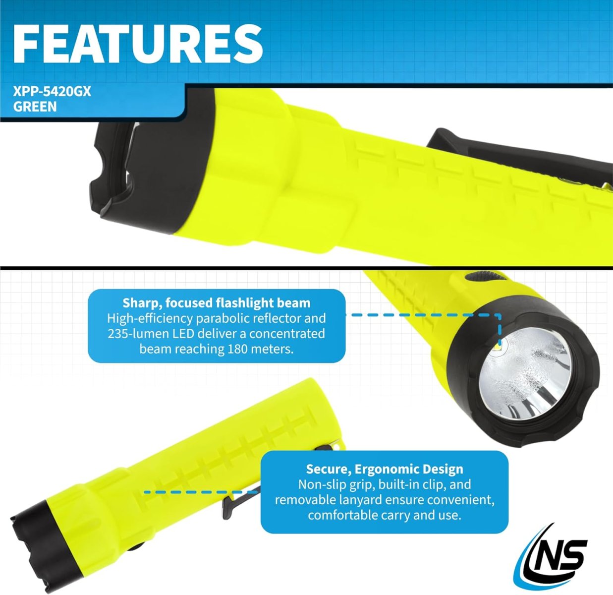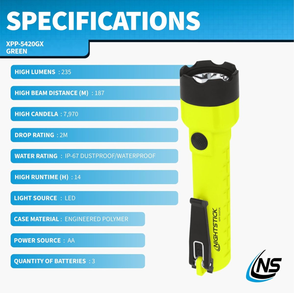 - The XPP-5420GX uses an LED rated at 235 lumens that works in conjunction with a high-efficiency deep parabolic reflector to create a usable flashlight beam rated at 187 meters. The single body switch provides momentary or constant-on functionality. Power comes from 3 AA (not included).