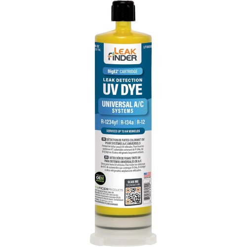 - The Tracer Products LF1800 BigEZ Universal A/C Dye Cartridge is a prefilled, multi-dose UV fluorescent dye used to detect refrigerant leaks in automotive A/C systems containing R-134a, R-1234yf, or other refrigerants.
