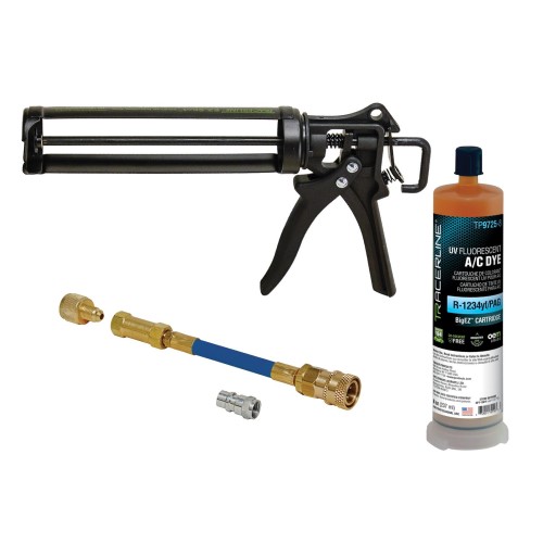 • The Tracer Products Tracerline EZ-Shot Dye Injection Kit is a must-have tool for any automotive technician who needs to diagnose and repair air conditioning leaks. The kit includes everything you need to inject a fluorescent dye into your vehicle's A/C system, making it easy to find even the smallest leaks. The dye is visible under ultraviolet light, so you can use a black light to pinpoint the exact location of the leak.