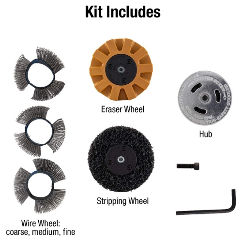 A: Yes. The kit supports replacement of the stripping wheel, eraser wheel, wire wheels (coarse, medium, fine), and hub adapter.