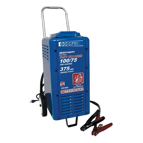 - The Associated 6001A Battery Charger is a steel wheeled fleet charger for 6 and 12 volt batteries. It provides 100 amps continuous charging at 6 volts, 75 amps continuous at 12 volts, and a 375 amp crank assist mode for engine starting, making it ideal for shop and fleet maintenance.