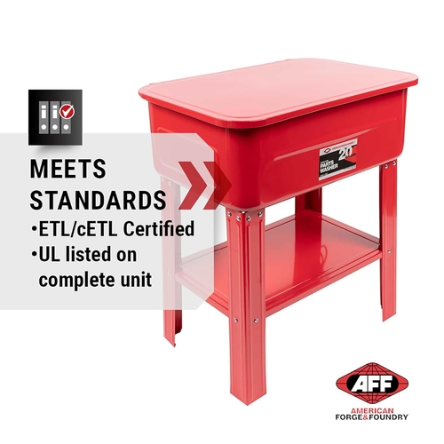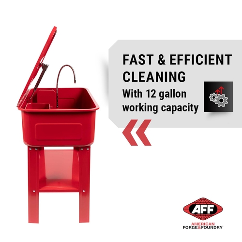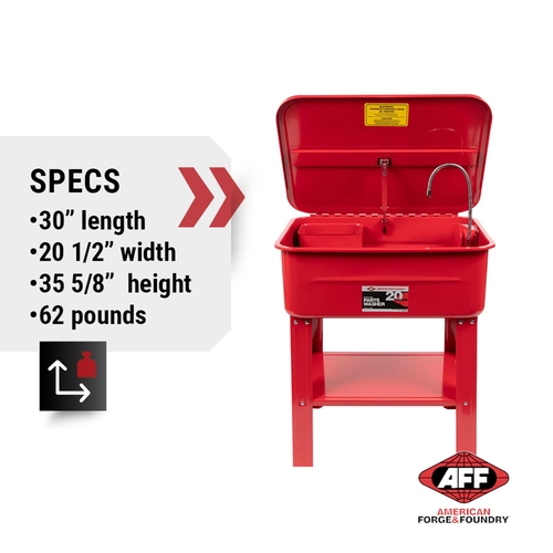 - American Forge & Foundry 31200B Parts Washer is built for automotive and equipment shops. It features a 20 Gallon tank with 12 Gallon working capacity, a 50 GPH pump, and comes with safety features and accessories for efficient parts cleaning.