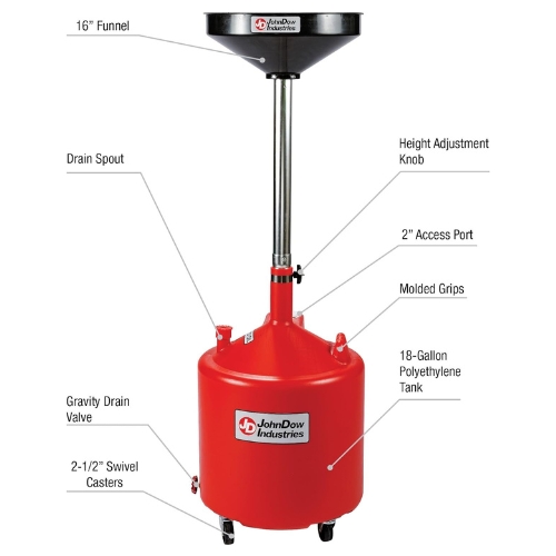 - The John Dow JDI-18DCP Economy Portable Poly Oil Drain is a translucent polyethylene tank with 18 gallon capacity, height adjustable from 48 to 71 inches. It includes a 16-inch funnel, 2-1/2 inch swivel casters for mobility, molded grips, a gravity gate drain valve, 1-1/2 inch drain spout with cap, and a 2-inch access port for suction wand or adding other fluids.