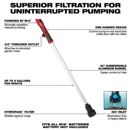 • Pumps up to 9 gallons per minute when handling clear water flow; on a single M12 redlithium XC 4.0 battery can move up to 275 gallons of water before recharge.
