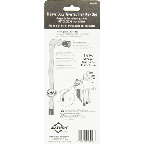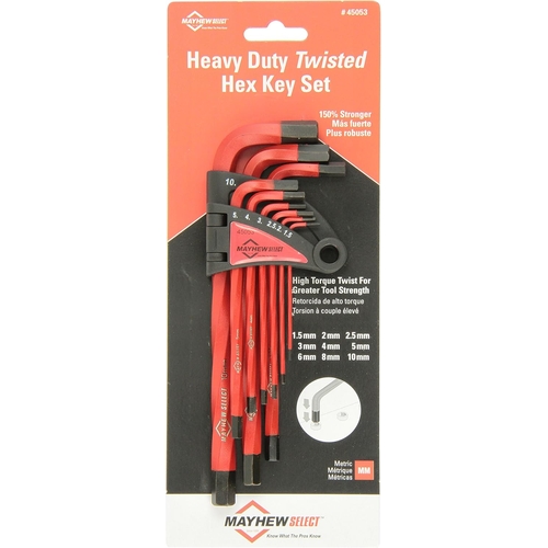 - The Mayhew 45053 Metric Twisted Hex Key Set is a heavy-duty nine-piece S2 tool steel L-key set designed for enhanced torque capacity and corrosion resistance, ideal for precision and general hex fastener work.