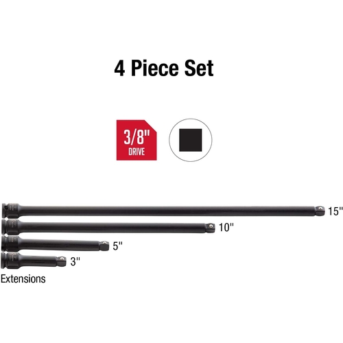 Sunex 3504 Wobble Impact Extension Set, 3/8 inch Drive, CR-MO Steel, 3 inch to 15 inch Lengths, 4 Piece