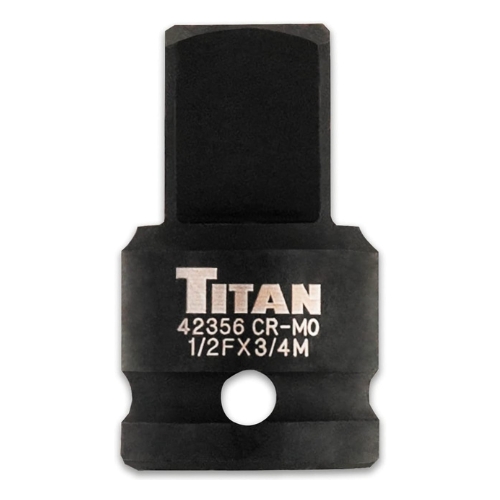 - The Titan 42356 adapter is designed to convert a 1/2" drive tool into a 3/4" drive output, allowing users to work with a wider range of sockets and attachments. Built for durability and high torque applications, this tool is ideal for both automotive professionals and industrial mechanics. Its compact size and Chrome Vanadium Steel finish offer corrosion resistance and easy handling in tight spaces.