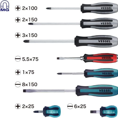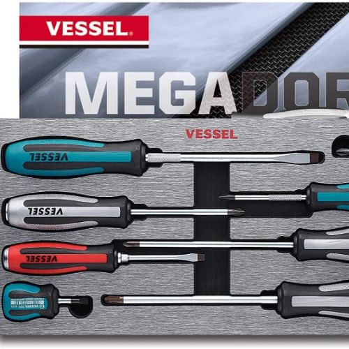 - The Vessel Tools 980MIXEVA MEGADORA IMPACTA Assorted Screwdriver Set is a versatile and high-quality toolset designed for various fastening tasks. This set includes eight different screwdrivers, each with specific features to ensure optimal performance, durability, and ease of use. The EVA foam inlay keeps the tools organized and protected, making this set ideal for both professional and DIY use.
