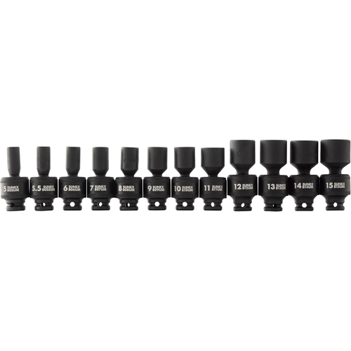A: It includes twelve universal impact sockets: 5 mm through 15 mm (including 5.5 mm), covering common metric fastener sizes.