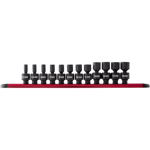 • The Sunex 1814 universal impact socket set includes twelve metric sockets from 5 mm to 15 mm on a 1/4 inch drive, featuring a 360-degree swivel universal design for improved access in tight areas and supplied in a heavy-duty storage case for organized transport and storage.