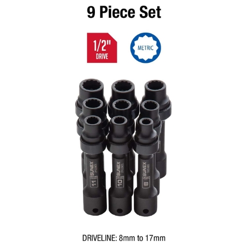 - The Sunex 2695 1/2 inch driveline limited clearance socket set contains 9 metric sockets from 8 mm to 17 mm designed to reach drivetrain and transmission fasteners in tight spaces, with 12-point configuration and radius corner design.