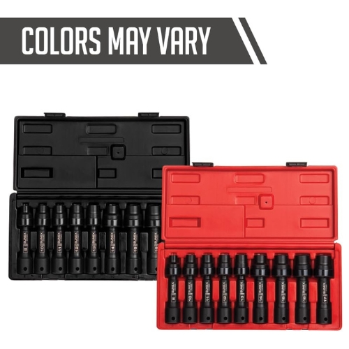 - Universal limited clearance impact sockets: 8 mm, 10 mm, 11 mm, 12 mm, 13 mm, 14 mm, 15 mm, 16 mm, 17 mm