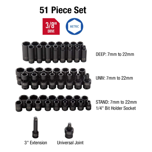 - The Sunex 3351 3/8" Drive Metric Impact Socket Set provides a comprehensive range of standard, deep, and universal metric sockets, precision-engineered from chromoly steel for strength and durability in professional impact applications.