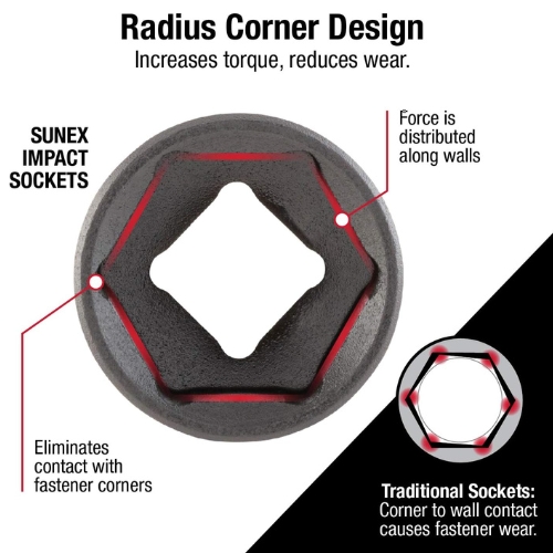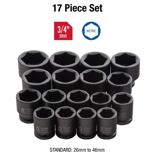 - The Sunex 4684 3/4 inch drive metric heavy duty impact socket set includes 17 sockets ranging from 26 mm to 46 mm, forged from Cr-Mo alloy steel, with radius corner design and dual size markings. It is intended for use in high-torque metric applications.