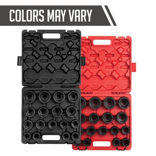 - Metric impact sockets (17): 26 mm, 27 mm, 28 mm, 29 mm, 30 mm, 32 mm, 33 mm, 35 mm, 36 mm, 38 mm, 40 mm, 41 mm, 42 mm, 43 mm, 44 mm, 45 mm, 46 mm