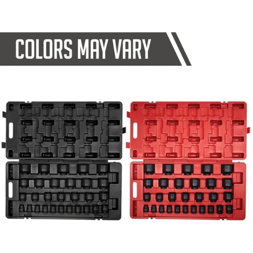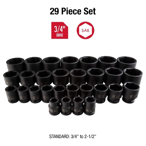 - Standard 6-point impact sockets (29): 3/4; 13/16; 7/8; 15/16; 1; 1-1/16; 1-1/8; 1-3/16; 1-1/4; 1-5/16; 1-3/8; 1-7/16; 1-1/2; 1-9/16; 1-5/8; 1-11/16; 1-3/4; 1-13/16; 1-7/8; 1-15/16; 2; 2-1/16; 2-1/8; 2-3/16; 2-1/4; 2-5/16; 2-3/8; 2-7/16; 2-1/2 inches