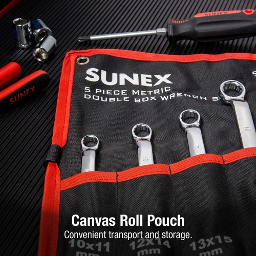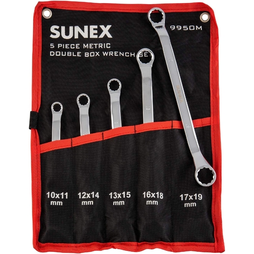 - Sunex 9950M is a metric double box wrench set designed for access and leverage on common fasteners. Covering 10 mm to 19 mm with 45 degree offset box ends and radius-corner geometry, the fully polished chrome finish resists corrosion. This is a general service tool set, not a replacement part.