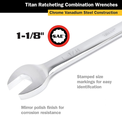 - The Titan 12615 Combination Ratcheting Wrench can also be referred to as 1-1/8" ratcheting wrench, 12-point combination wrench, Chrome Vanadium Steel wrench, SAE ratcheting spanner, and mirror polished ratcheting wrench.