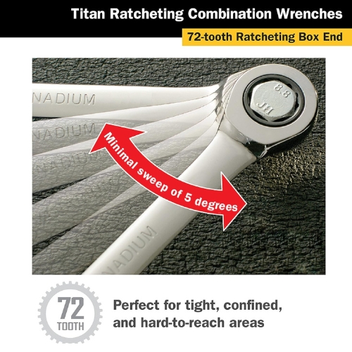 - The Titan 12615 Combination Ratcheting Wrench is engineered for professionals seeking efficiency and durability. Featuring a 72-tooth ratcheting box end and a 12-point opening, it ensures precise engagement with fasteners. Its mirror-polished Chrome Vanadium Steel steel construction offers both strength and corrosion resistance, making it ideal for automotive, mechanical, and industrial applications.