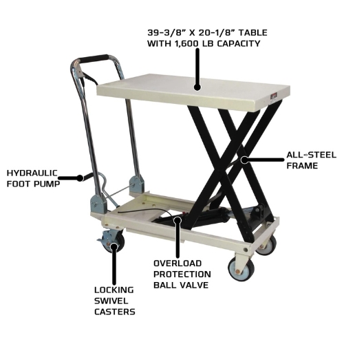 - The Jet 140779 SLT-1650 Scissor Lift Table is a heavy-duty steel lift table built for industrial, warehouse, and shop use. With a 1650 lb load capacity, hydraulic foot pump operation, and safety features, it makes lifting, positioning, and moving heavy materials safer and more efficient.