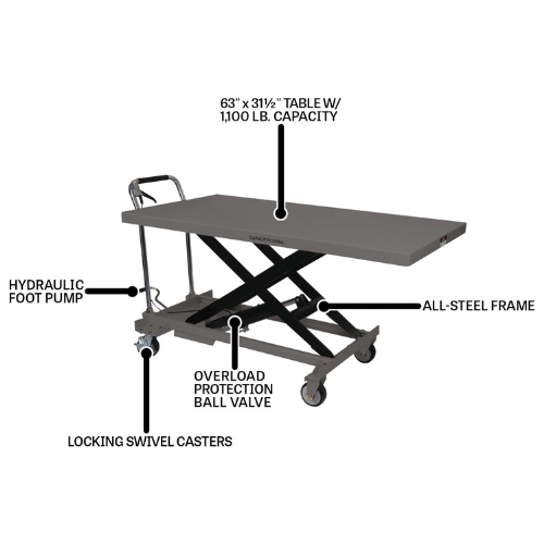 Jet 140780 SLT-1100 Jumbo Scissor Lift Table, Steel, 1100 lb Capacity, 63" x 31.5"