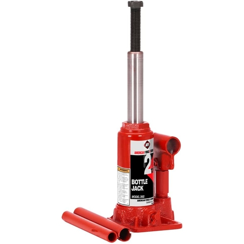 - American Forge & Foundry 3502 Bottle Jack is a manual heavy duty hydraulic jack with 2 Ton lifting capacity. It features centered pumps and ram with heat-treated piston for balance, machine hardened steel saddle, and screw extension for increased height.