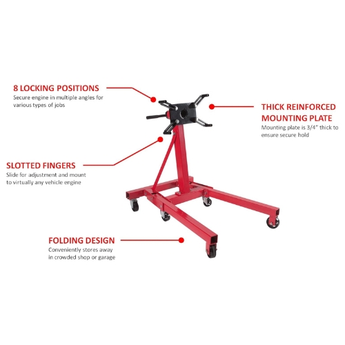 Sunex’s 8400 stand offers a strong yet compact solution for engine work. Its folding design, multiple locking angles, and robust construction yield practicality and versatility for garage and shop settings.