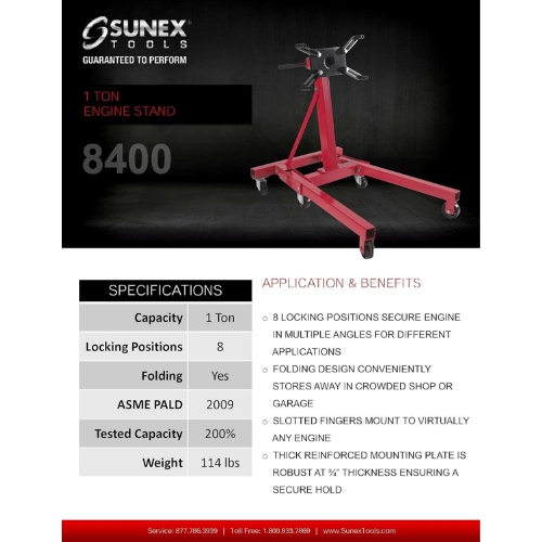 - This engine stand is also known as Sunex 1-Ton Folding Engine Stand, Sunex Model 8400 engine support stand, and Sunex foldable engine stand.