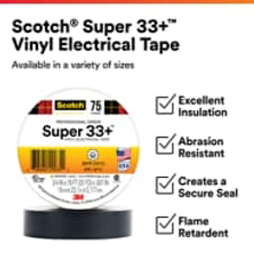 • The Scotch Super 33+ vinyl electrical tape can also be referred to as premium vinyl electrical tape, 3/4 Inch electrical tape, 7 mil PVC tape, Super 33 plus tape, and black insulating tape.