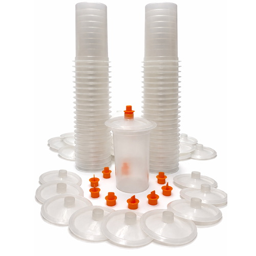 A: Kit 50 includes 50 disposable 24 oz (710 mL) cups and 50 disposable 200 micron filter lids.