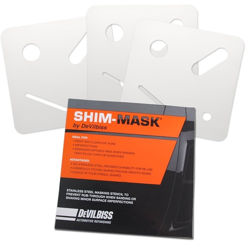 - DeVilbiss 803654 Shim-Mask is a stainless steel masking stencil used in automotive refinishing to help prevent rub-through while sanding or shaving minor surface imperfections. The 304 stainless steel shim mask includes four stencil shapes and measures 120 mm by 120 mm. Pack of three for repeated repairs.