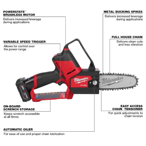 - Milwaukee 2527-21 is an M12 Fuel Hatchet pruning saw kit designed for controlled pruning in tight spaces. It pairs a brushless motor with a compact 6 inch bar and includes an M12 REDLITHIUM XC 4.0 battery and M12 charger. This is a complete kit, not a replacement part.