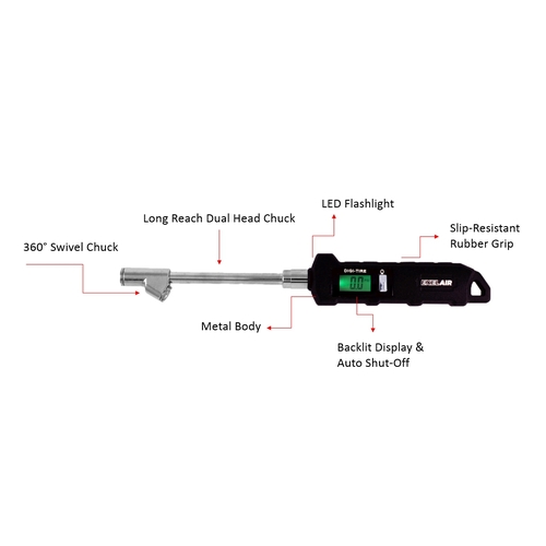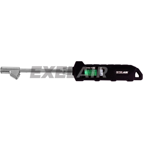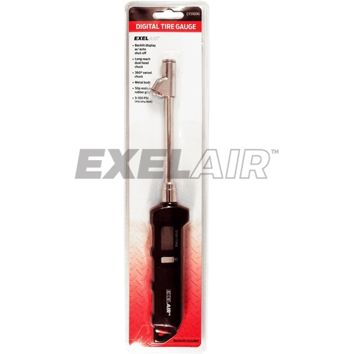 - This gauge may also be referred to as EXELAIR digital dual head gauge, swivel tire pressure tool, tire inflator with built-in flashlight, and heavy-duty digital tire service gauge.