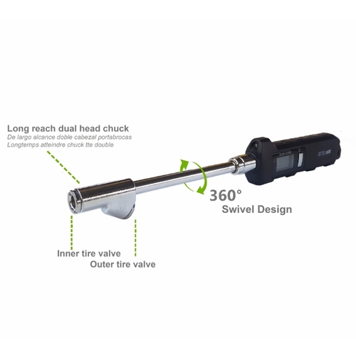 - Dual-head straight-foot chuck with full 360 degree swivel - provides extended reach and effortless connection to both standard and dual tire valve stems.