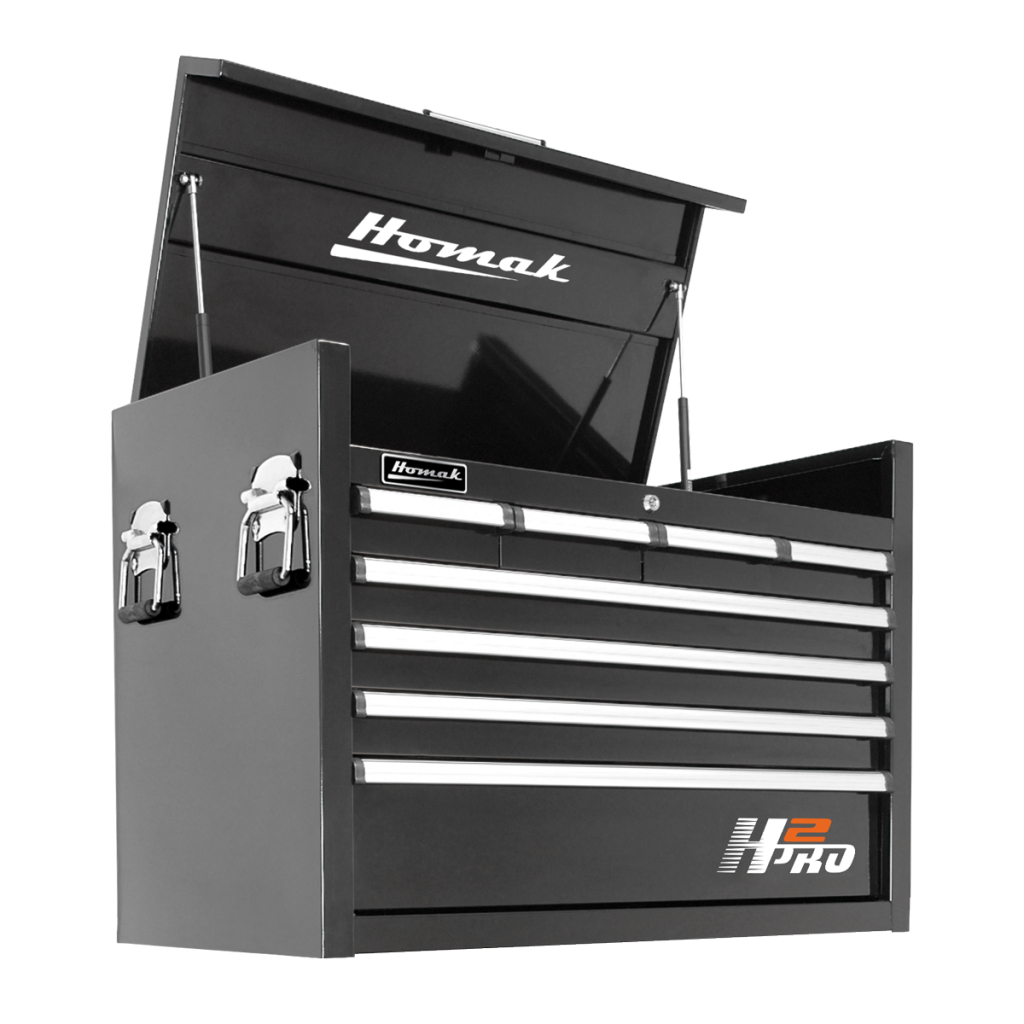 • The H2PRO Series Homak toolboxes are designed for the professional and features full length aluminum drawer pulls; HMC high security tubular locking system; removable ball bearing slides; 3. 2mil powdercoat paint finished; EVA drawer liners and top mat included; full extension gas struts.